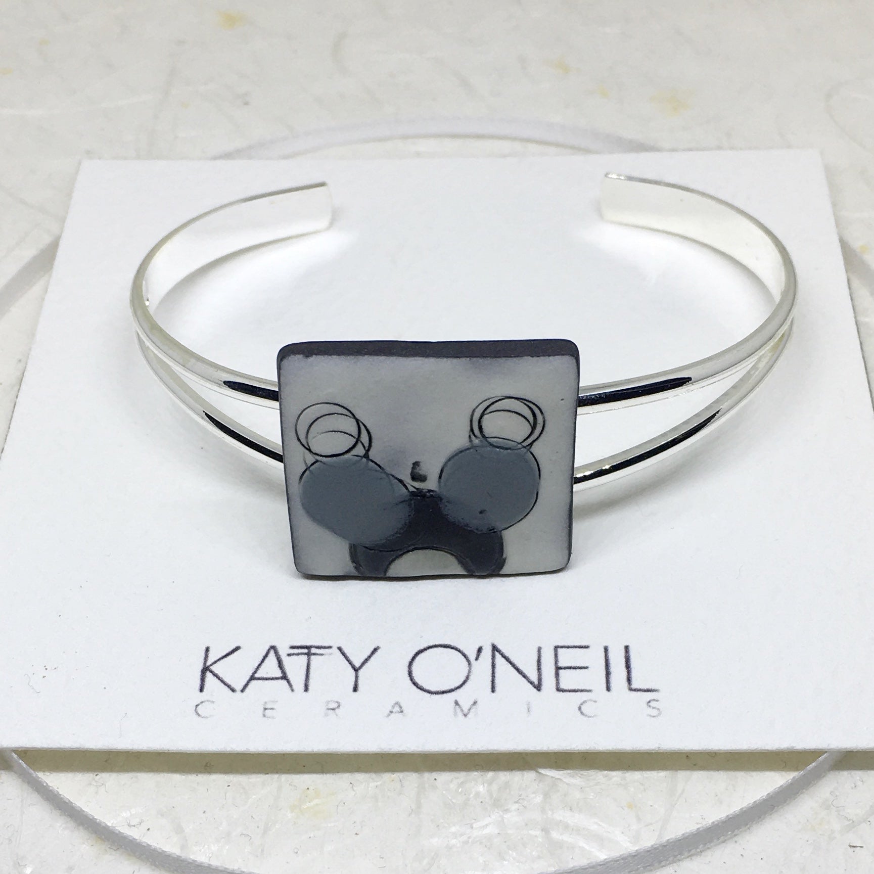 Size GuideThe square ceramic piece is handmade using the finest smooth Black Onyx Porcelain decorated with white porcelain slip. The impressed circular design is glazed with purple and blue before being high fired for durability. The bangle can be easily adjusted...