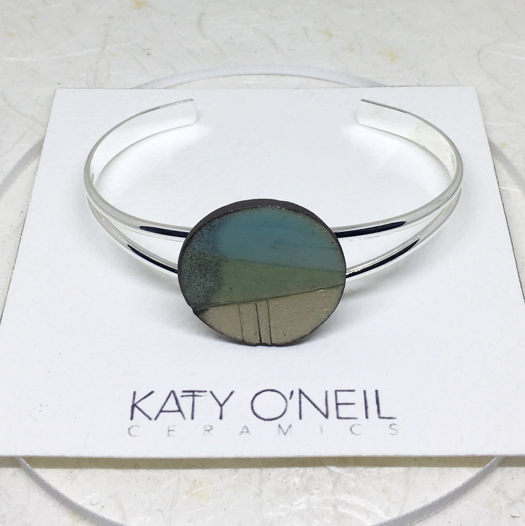Size GuideThe round ceramic piece is handmade using the finest smooth Porcelain clay, the impressed design is highlighted with oxide, glazed with translucent turquoise and green before being high fired for durability. The bangle can be easily adjusted to suit your...