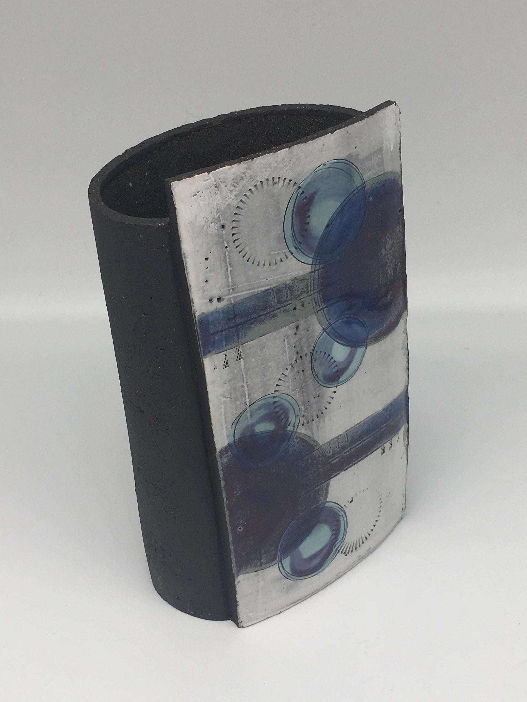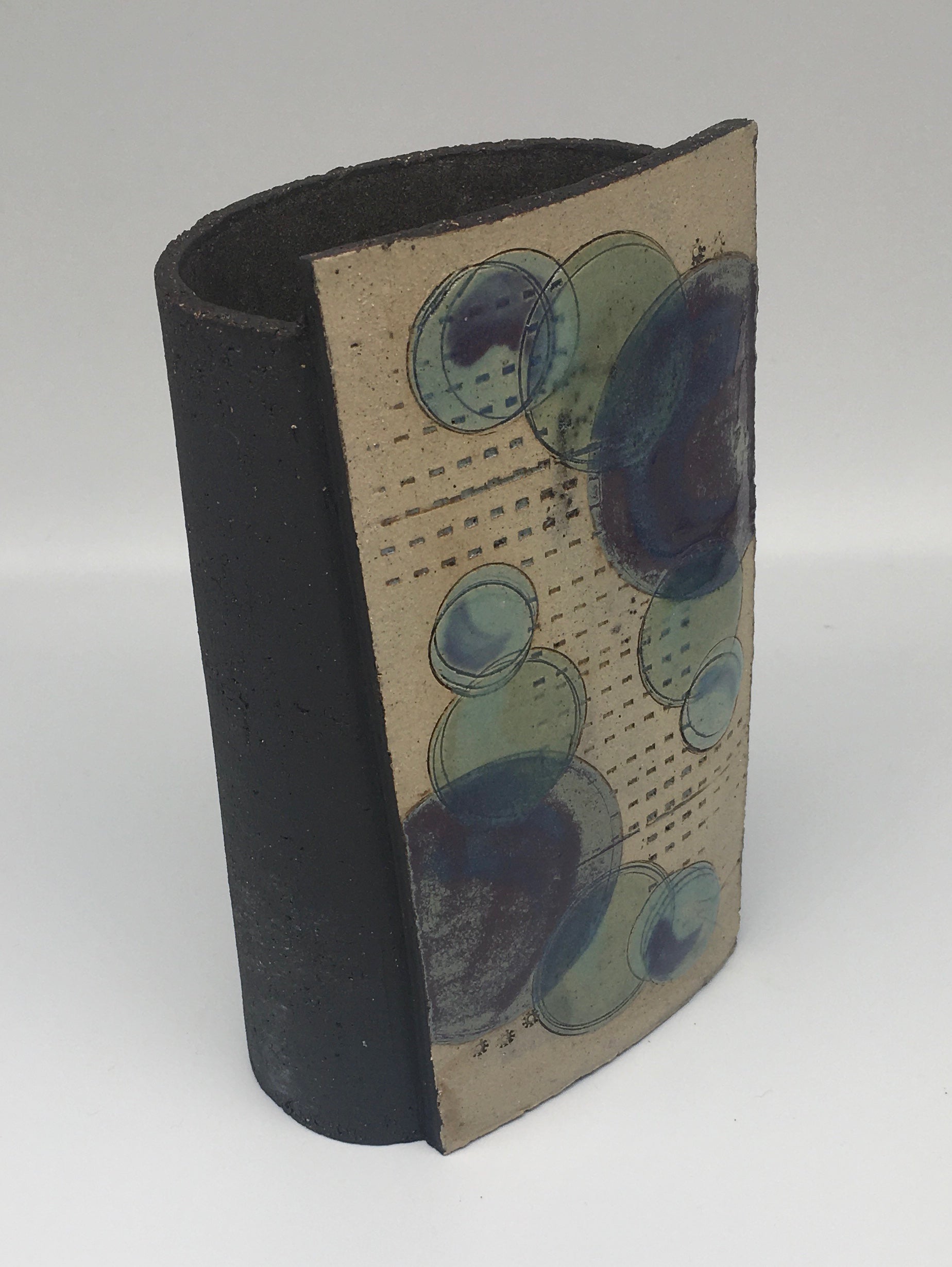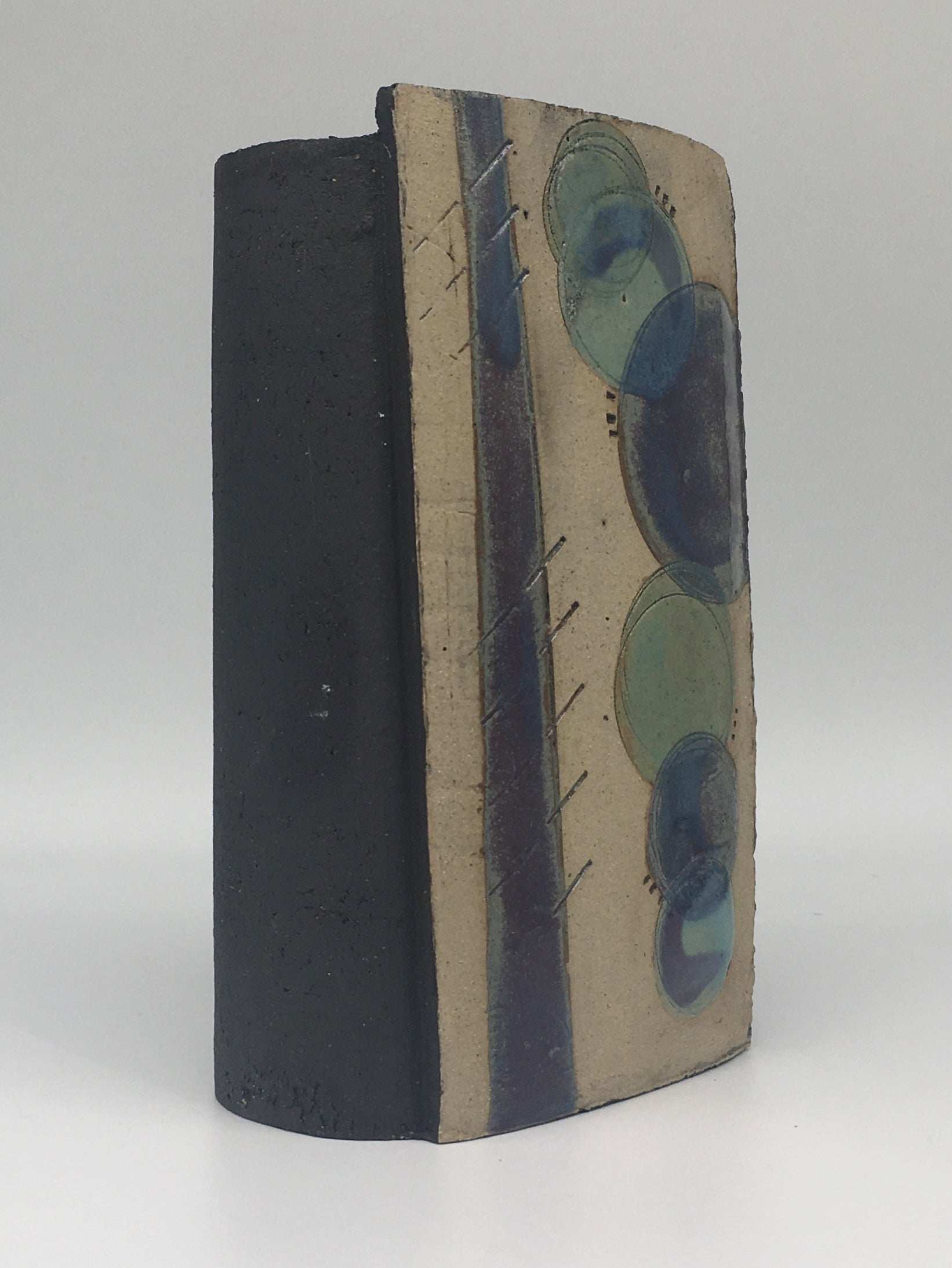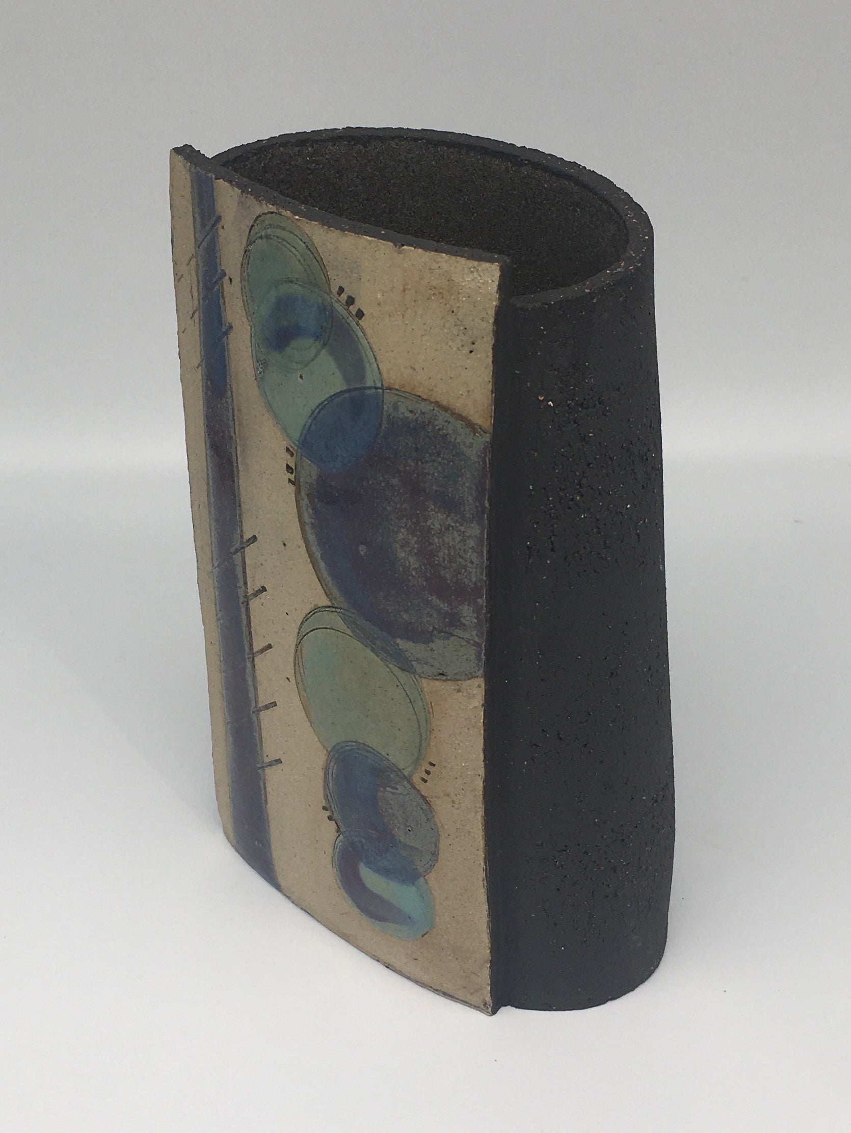 Size GuideAn individually crafted form, created from textured black clay with a raised front panel which is decorated with slips and glazes over impressed textures. The piece is slab built and oval in shape. It is one of a collection of...