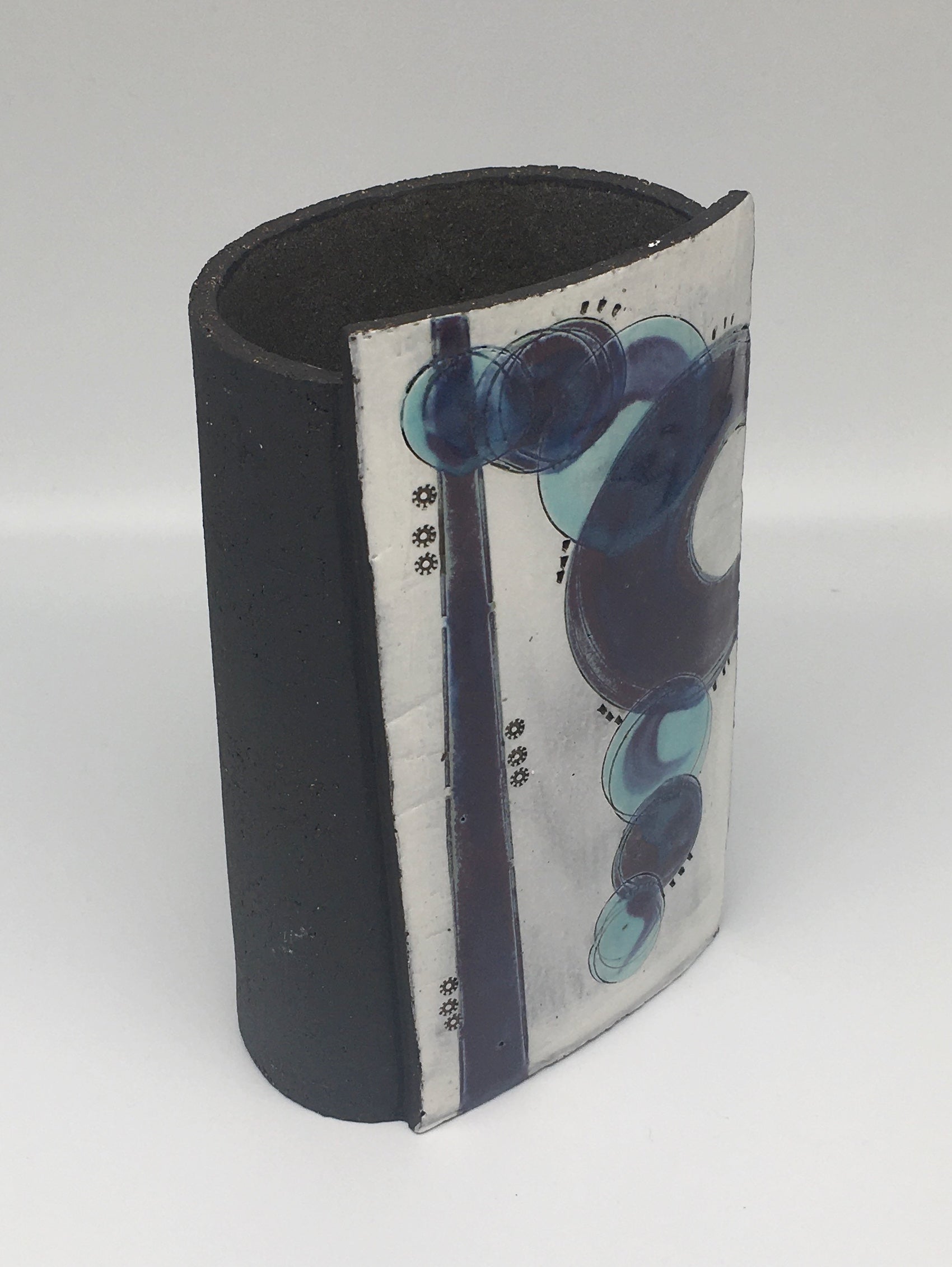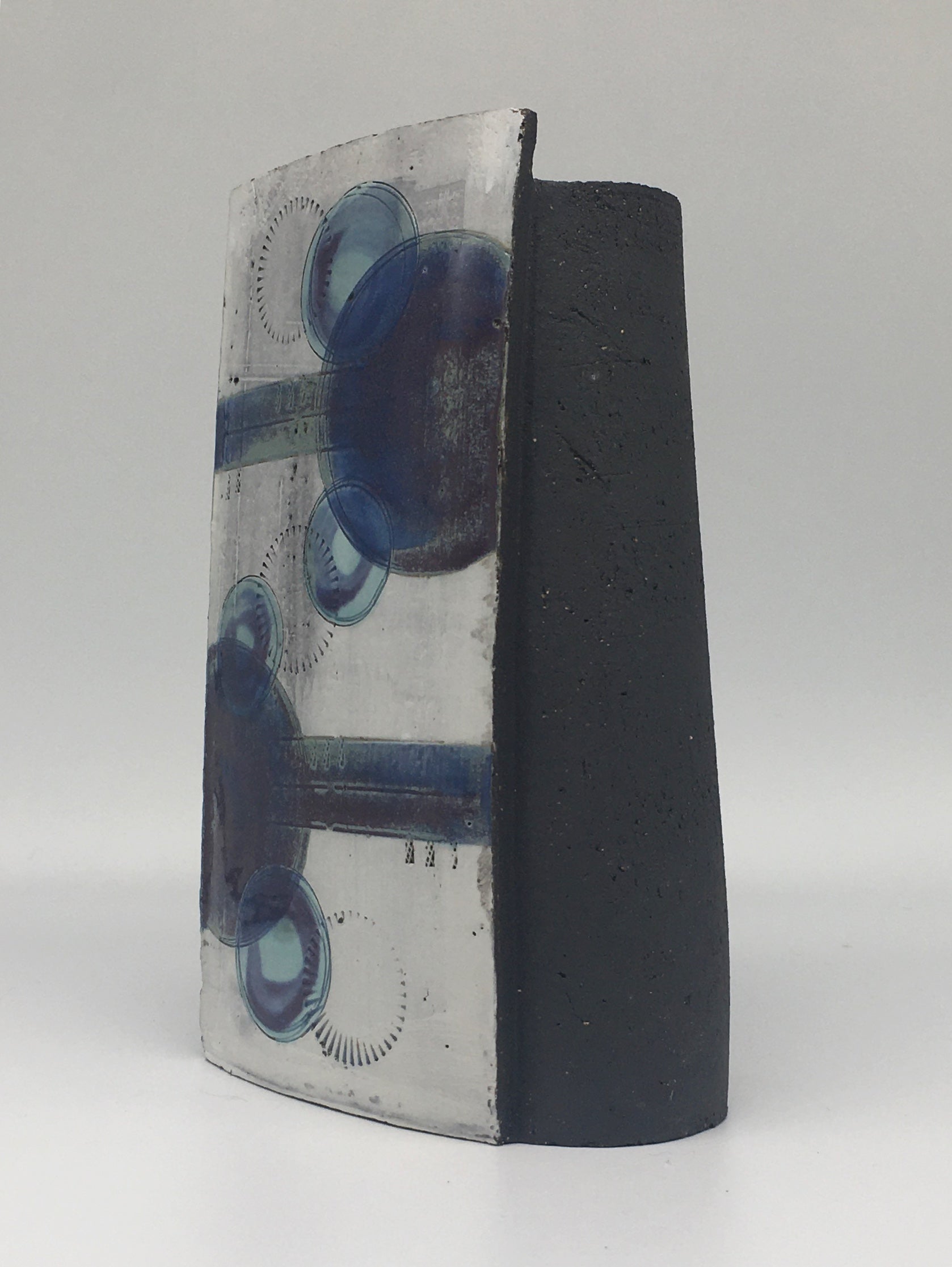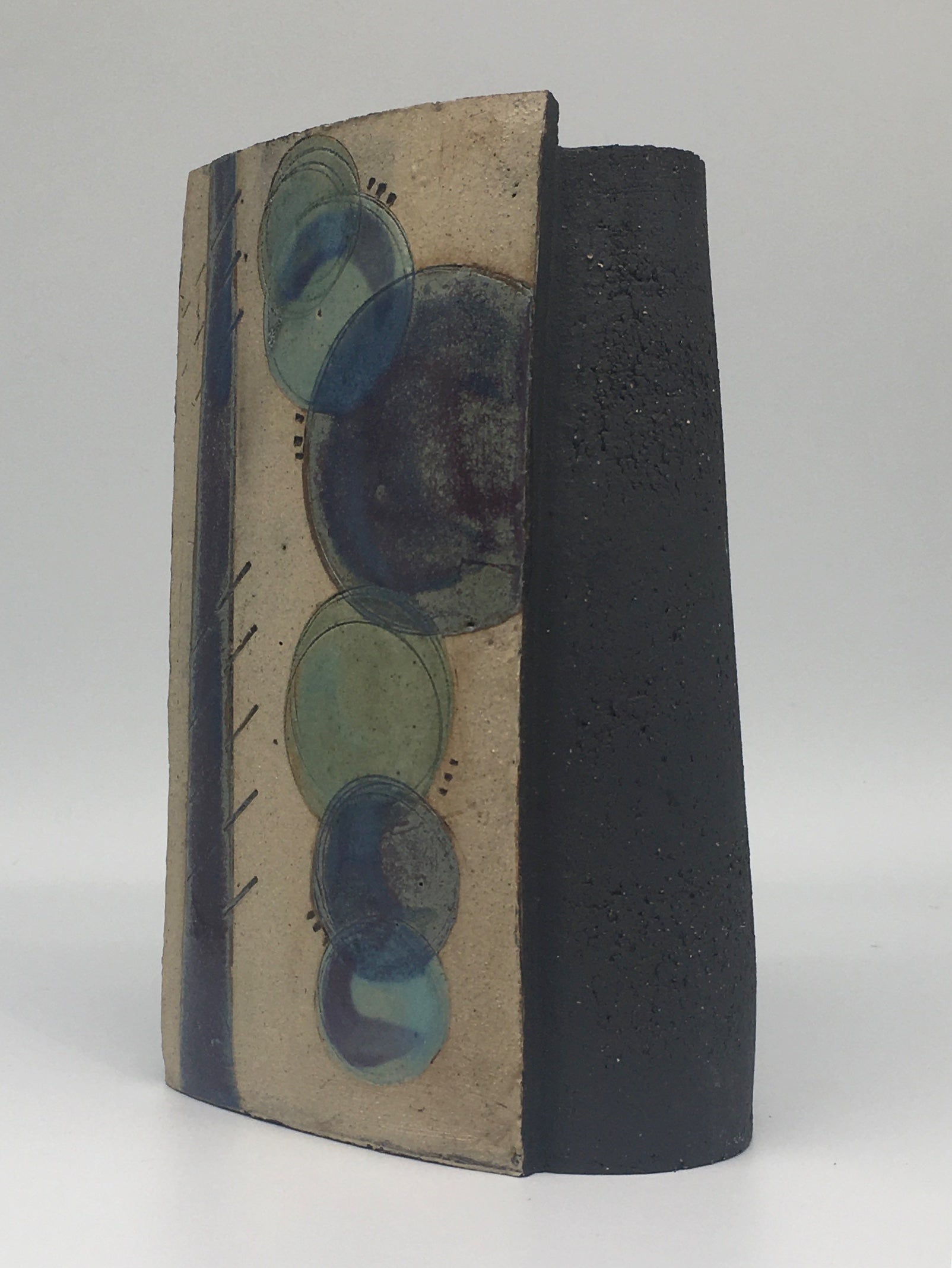 Size GuideAn individually crafted form, created from textured black clay with a raised front panel which is decorated with slips and glazes over impressed textures. The piece is slab built and oval in shape. It is one of a collection of...