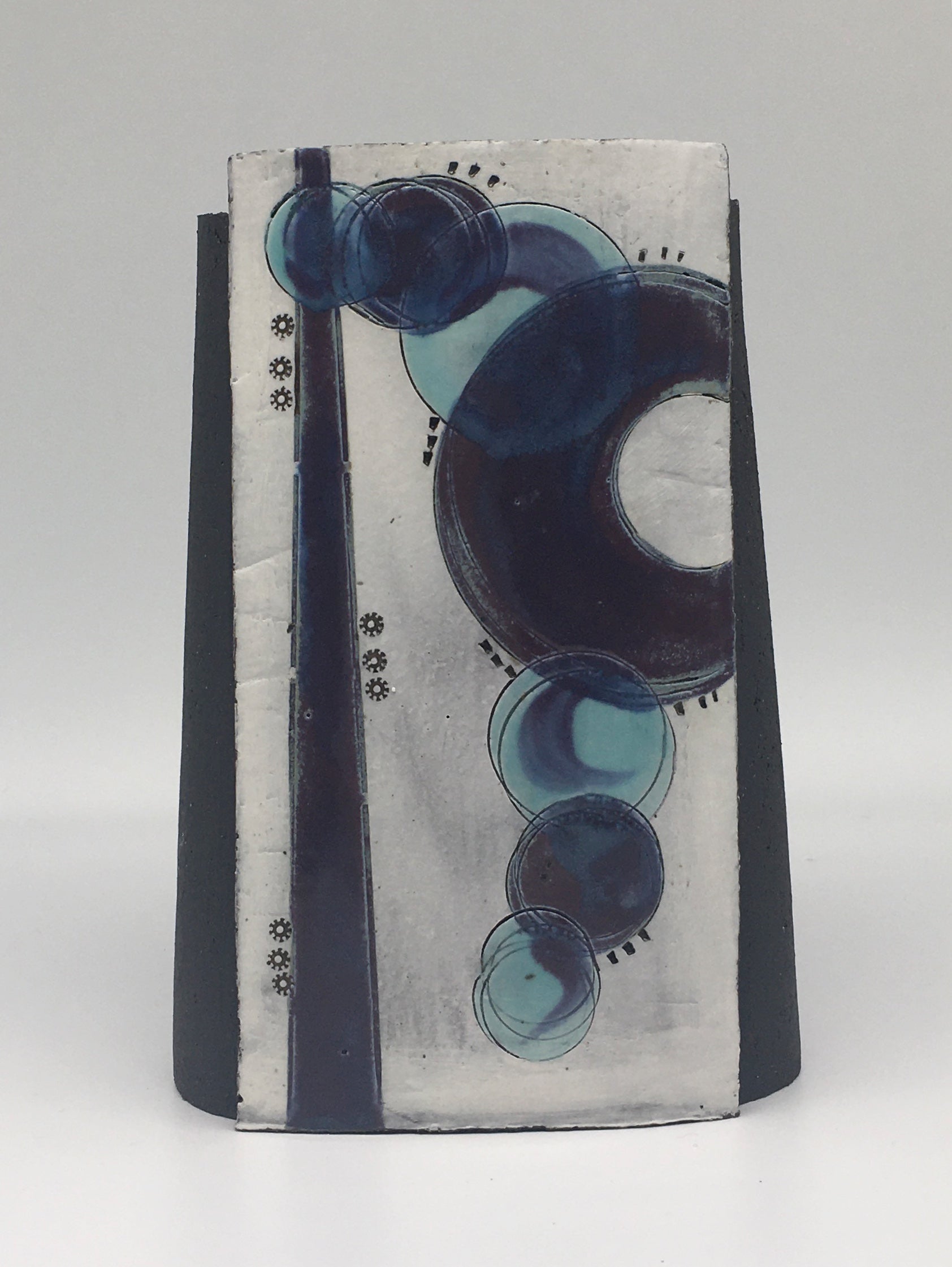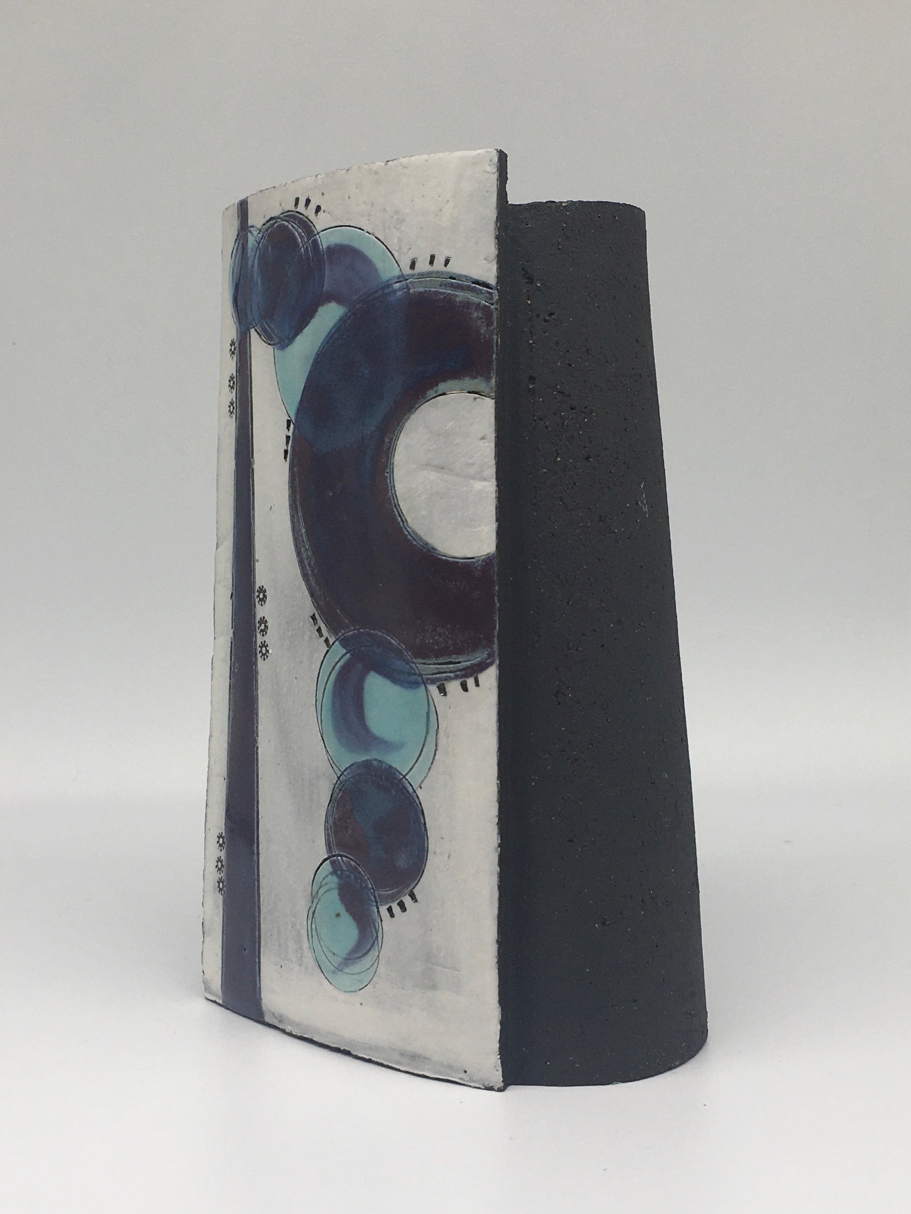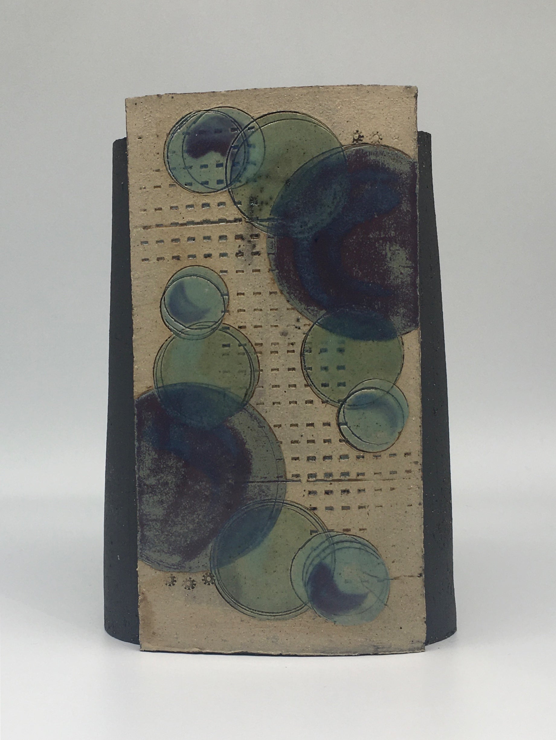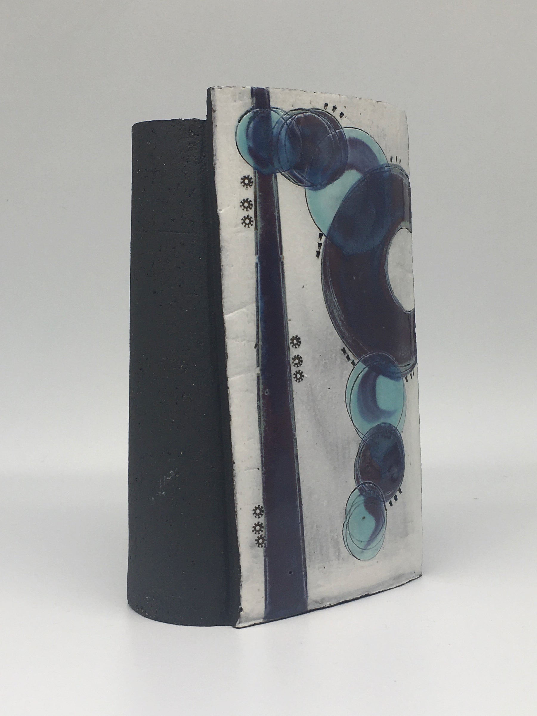 Size GuideAn individually crafted form, created from textured black clay with a raised front panel which is decorated with slips and glazes over impressed textures. The piece is slab built and oval in shape. It is one of a collection of...