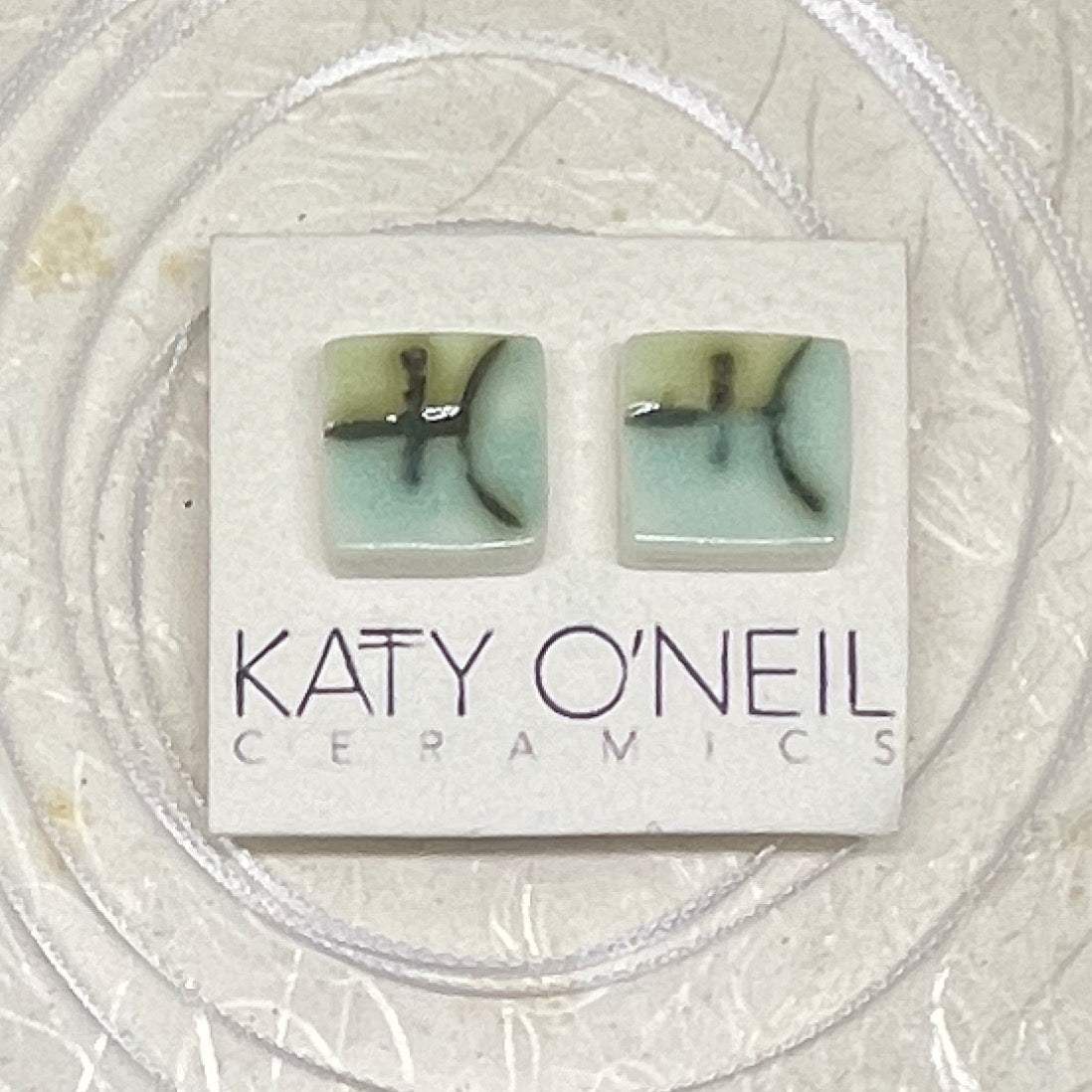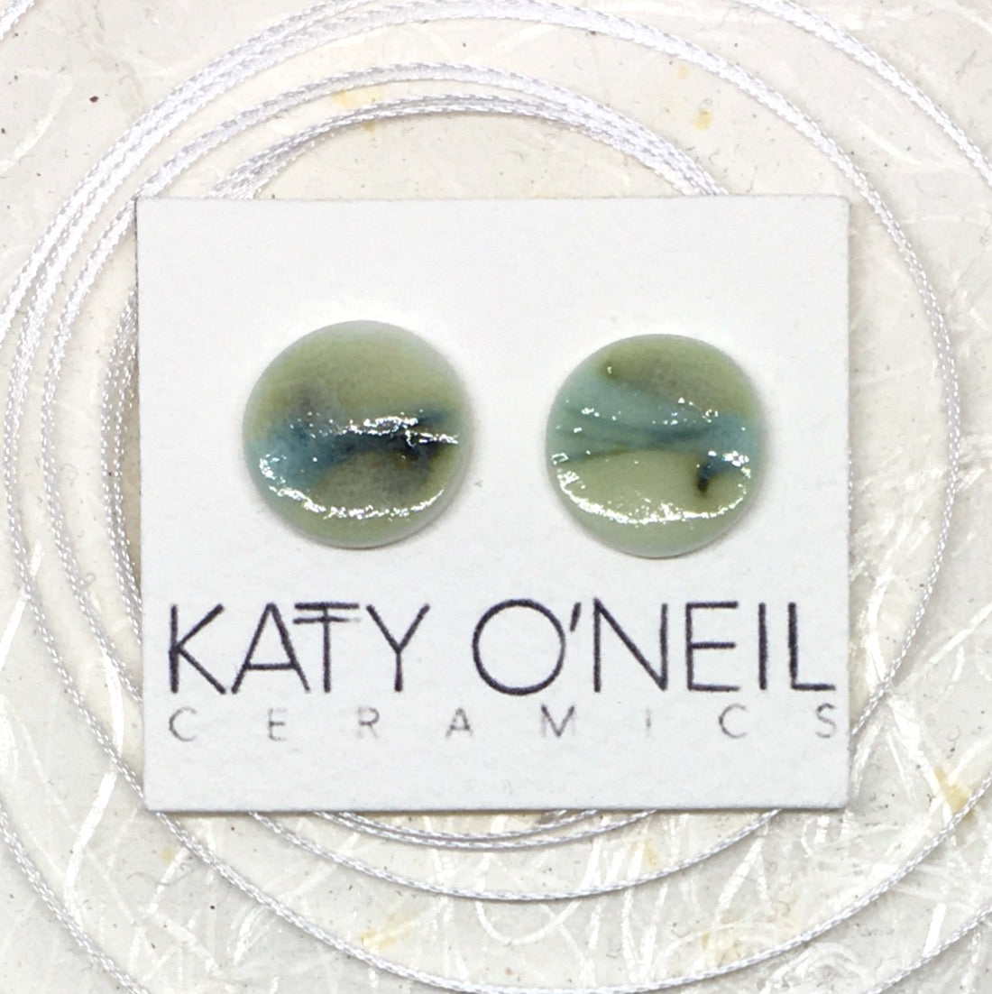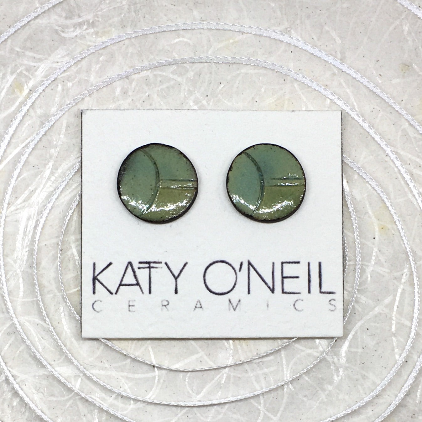 Size GuideHandmade using the finest smooth Porcelain clay, the impressed design is highlighted with oxide, glazed with translucent green before being high fired for durability. Ear posts and scrolls are made from surgical steel and are hypoallergenic - perfect for those...