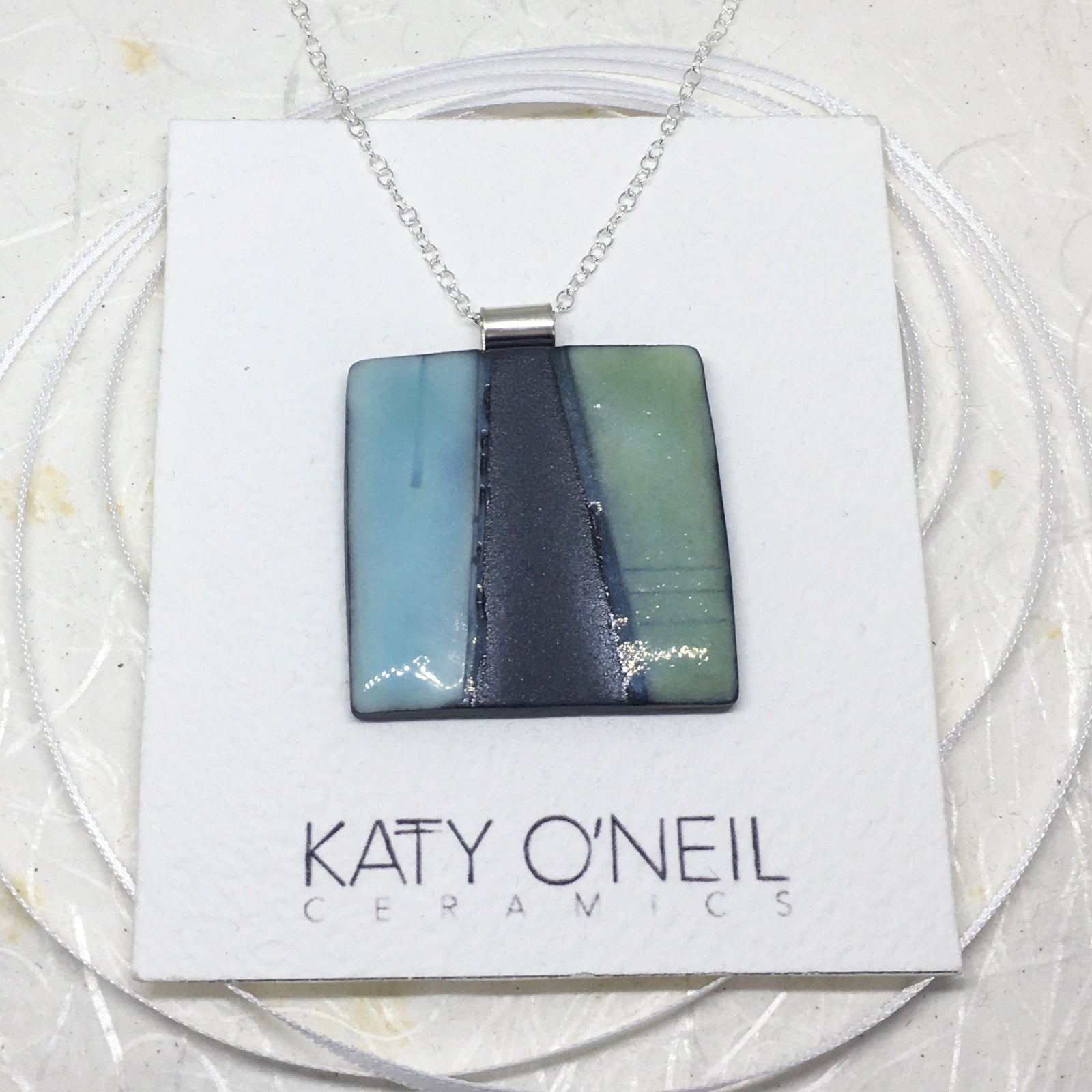 Size GuideThis large, unique, square pendant is individually handmade using the finest smooth Porcelain clay. The impressed design is highlighted with oxide, glazed with translucent turquoise and green before being high fired for durability. Each pendant is finished with a sterling...
