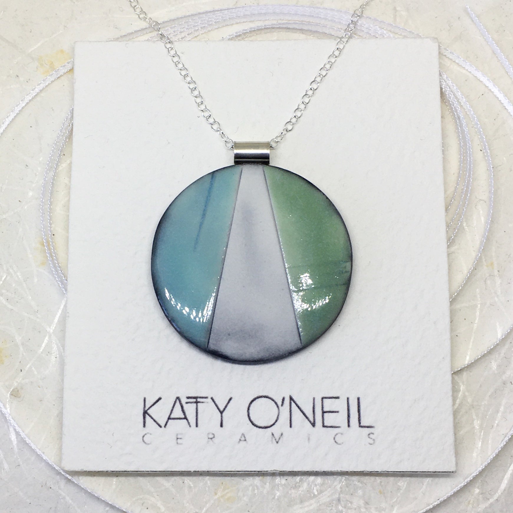 Size GuideThis large, unique, round pendant is individually handmade using the finest smooth Porcelain clay. The impressed design is highlighted with oxide, glazed with translucent turquoise and green before being high fired for durability. Each pendant is finished with a sterling...