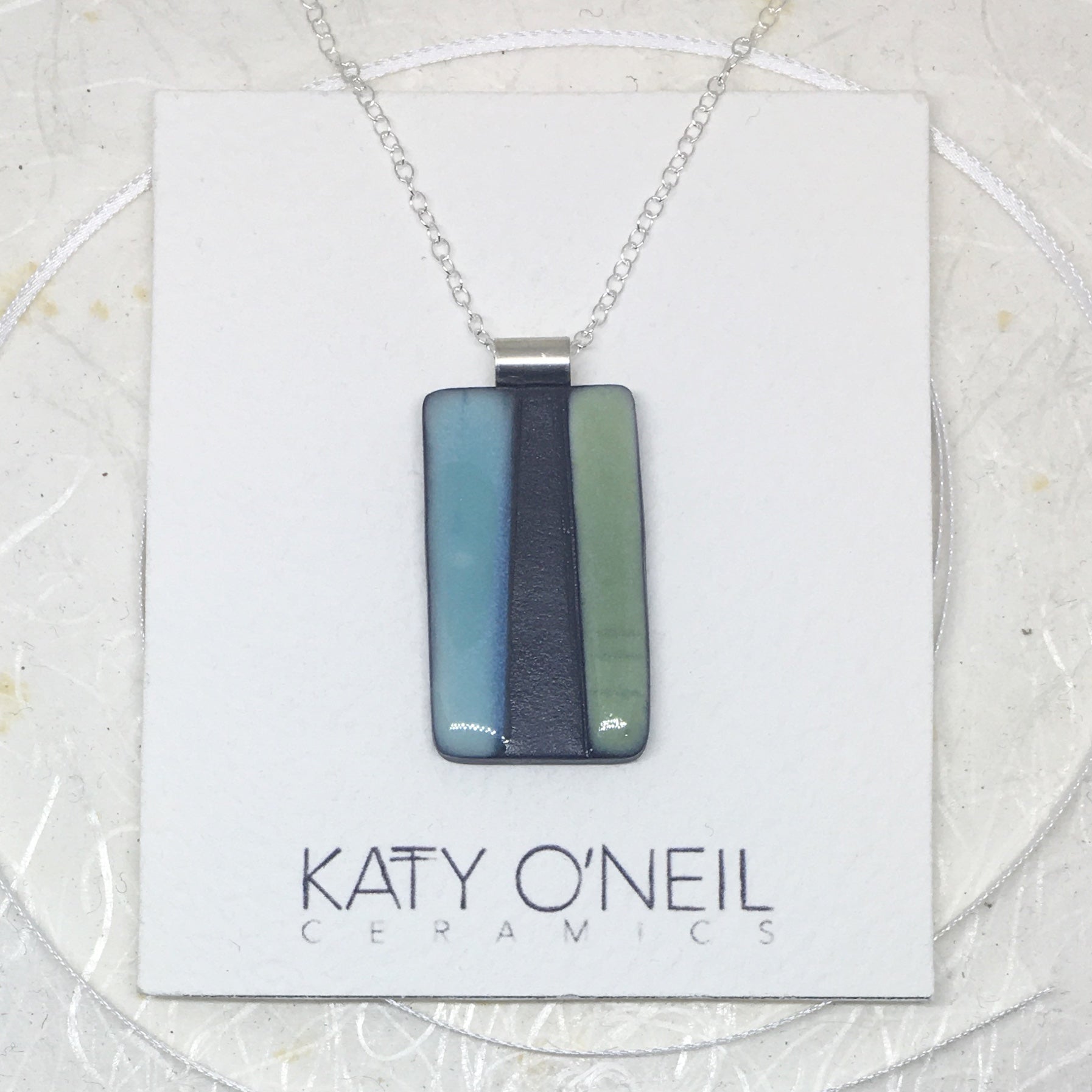Size GuideThis medium, unique, oblong pendant is individually handmade using the finest smooth Porcelain clay, the impressed design is highlighted with oxide, glazed with translucent turquoise and green before being high fired for durability. Each pendant is finished with a sterling...