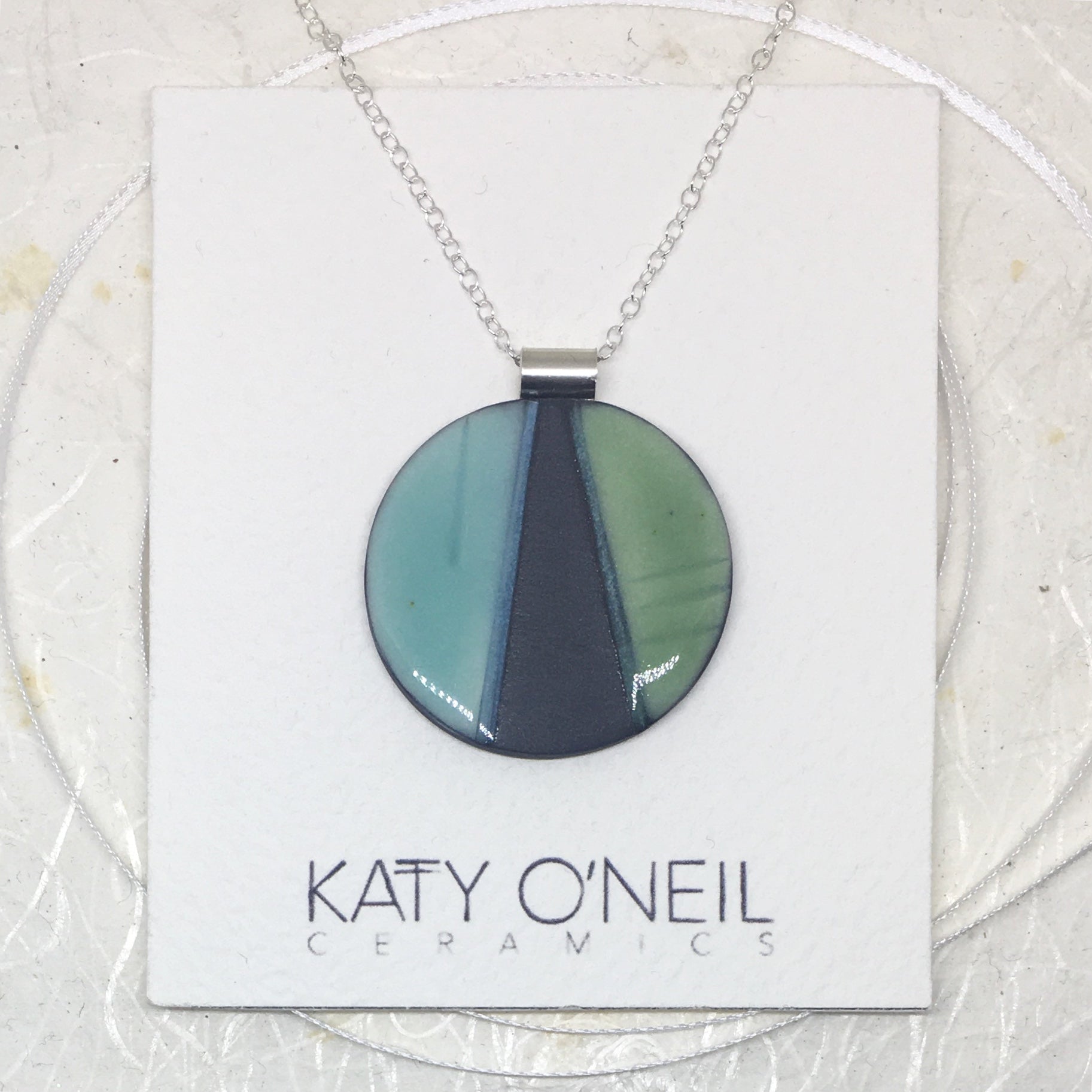 Size GuideThis medium, unique, round pendant is individually handmade using the finest smooth Black Onyx Porcelain decorated with white porcelain slip. The impressed circular design is glazed with translucent turquoise and green before being high fired for durability. Each pendant is...