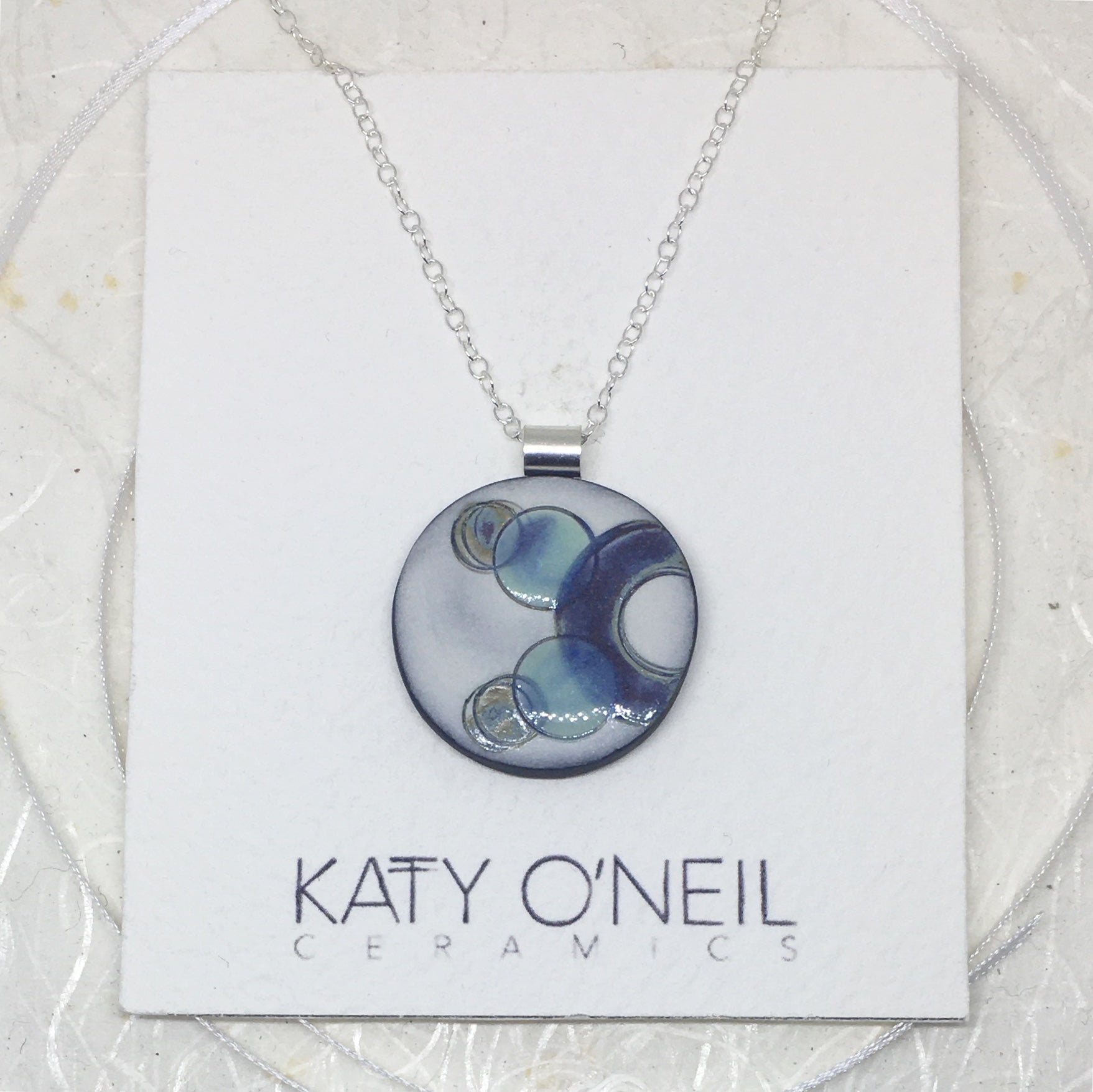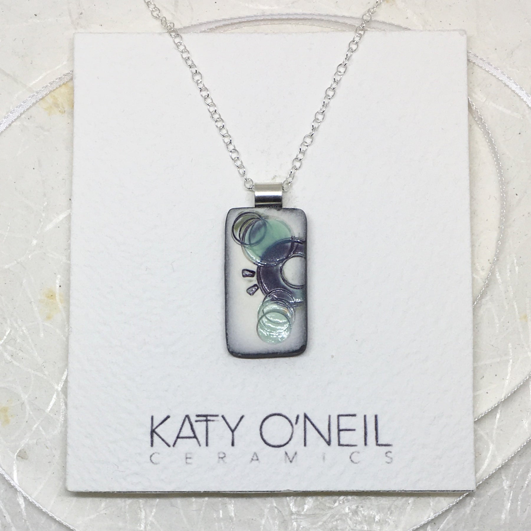 Size GuideThis small, unique, oblong pendant is individually handmade using the finest smooth Black Onyx Porcelain decorated with white porcelain slip. The impressed circular design is glazed with purple and blue before being high fired for durability. Each pendant is finished with...