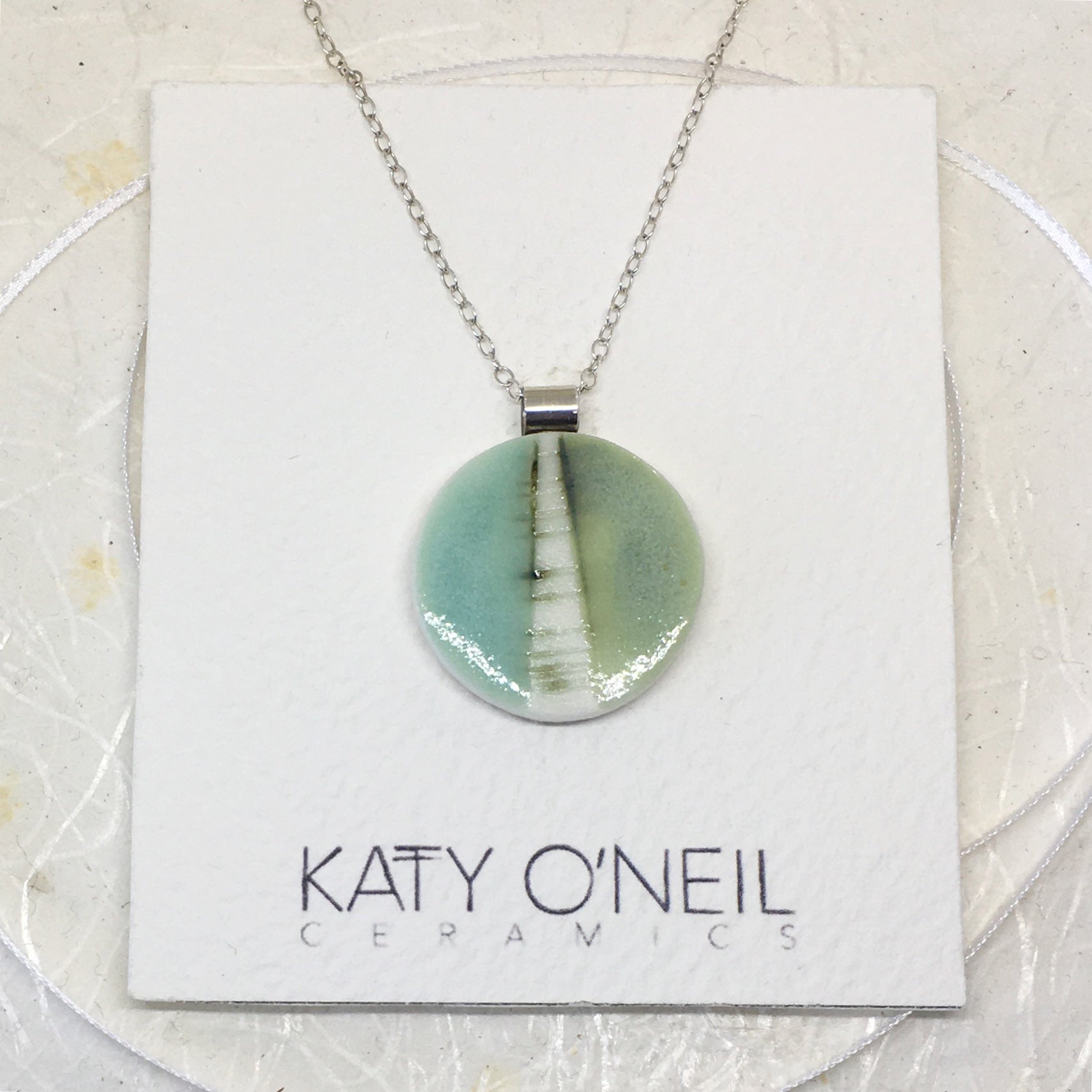 Size GuideThis small, unique, round pendant is individually handmade using the finest smooth Porcelain clay. The impressed design is highlighted with oxide, glazed with translucent turquoise and green before being high fired for durability. Each pendant is finished with a sterling...