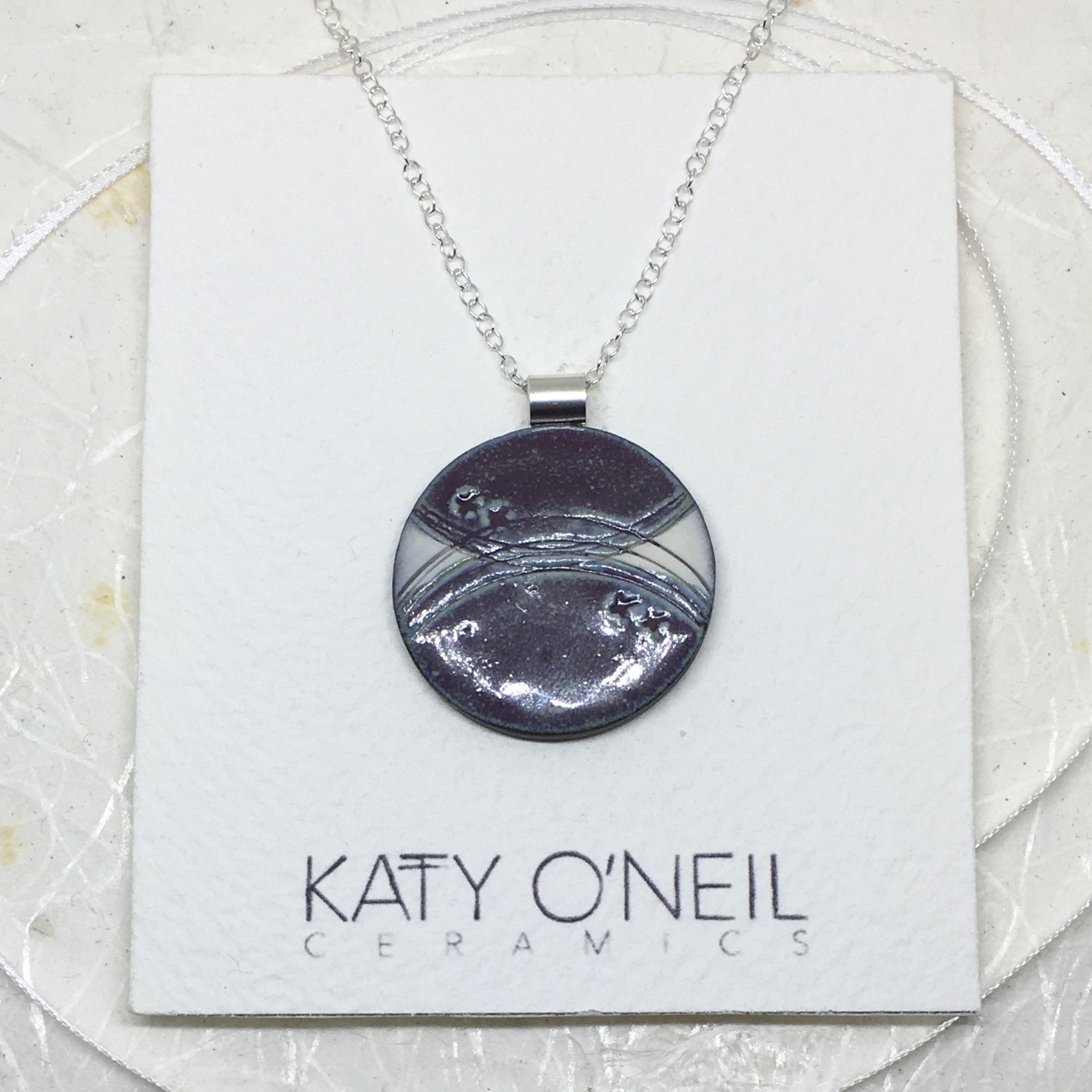 Size GuideThis small, unique, round pendant is individually handmade using the finest smooth Black Onyx Porcelain decorated with white porcelain slip. The impressed circular design is glazed with purple and blue before being high fired for durability. Each pendant is finished with...